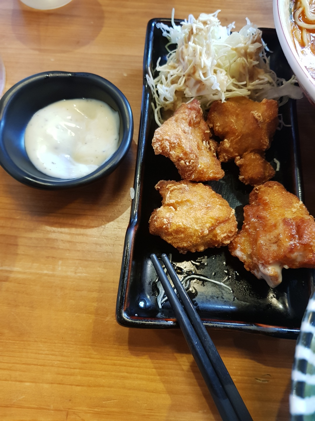 치킨가라아케에 저는 점심시간에만 나오는 작은컵 맥주 한잔과 함께 안주로도 훌륭한 라멘과 함께 먹으면