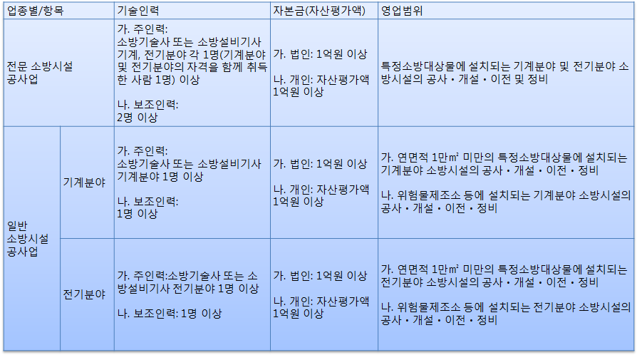 소방시술공사업 면허는 기술자 조건과 업무영역에 따라 전문과 일반으로 나누어지며 신청업종은 아래표를 참고하시어