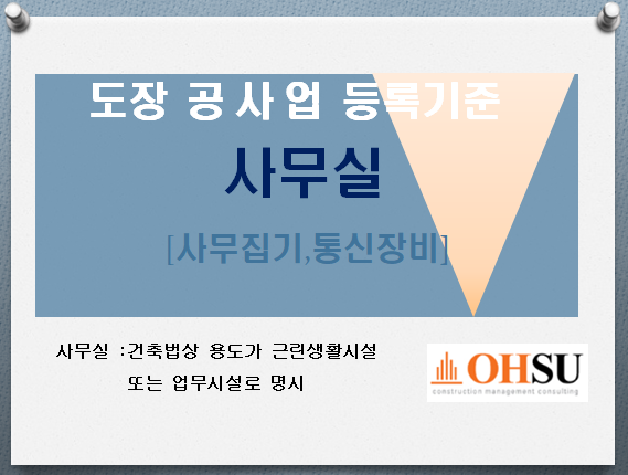 근린생활시설,업무시설,공장내사무동등 건설업에서 인정하는 사무실로 사용하기 적합한용도이어야 하며, 주거용,단독주택이나 등기가 되어 있지 않은 가건물등은 접수시 반려될수 있습니다