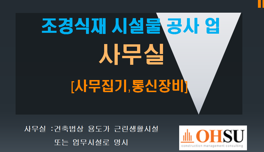 조경식재시설물면허는 필요한 장비 기준은 없지만 시설로 사무실을 갖춰야 합니다. 공부상 용도인 근린생활시설이나 업무시설 오피스텔등 건설업에서 인정하는 사무실 용도로 되어 있어야합니다.
