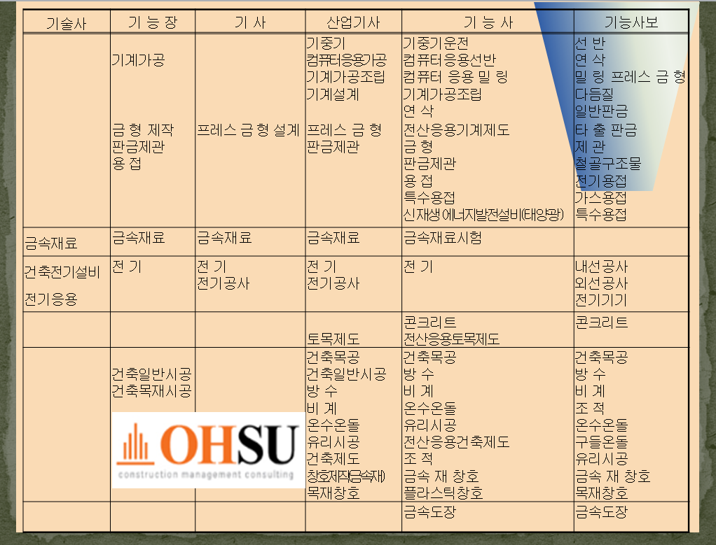 아래표의 국가기술자격증 보유자외에 건설기술인협회의 건축,토목,기계분야 셋중 하나의 경력수첩소지자도 가능