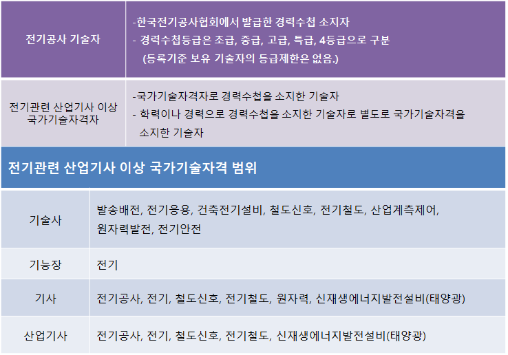 ▶또한 3명 모두 전기공사협회에서 발급된 초급이상의 경력수첩을 소지해야 하며, 산업기사이상 등급인 기술자요건은 아래표를 참고하여 준비하시길 바랍니다