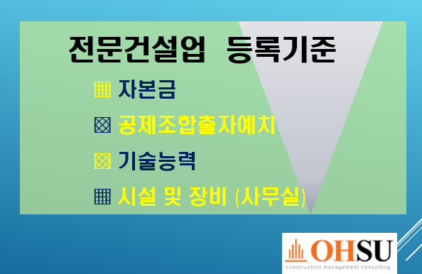 1500만원미만의 경미한 공사가 아닌이상 위와같은 공사를 하려면 전문건설 면허를 소유해야 합니다. 면허취득하려면 건설산업기본법에 의거해서 일정기준으로 갖추면 되며 이를 등록기준이라고 합니다.