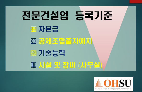 등록기준은 크게 4가지로 자본금,공제조합출자,기술능력,사무실 분류되며 각 항목별로 어떤 기준을 갖춰야하는지