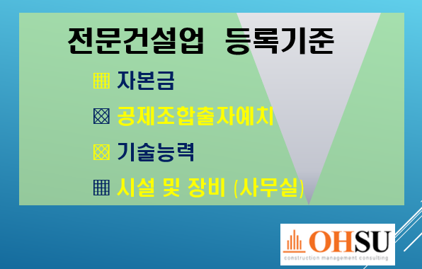 1500만원미만의 경미한공사가 아닌 이상 위와 같은 공사를 하려면 단종면허를 취득하야 하는데 건설산업기본법에 따른 일정한 요건을 갖춰야하며, 이를 등록기준이라고 합니다. 총 4가지로 자본금,공제조합출자예치,기술능력,시설 및장비로 나누어 집니다
