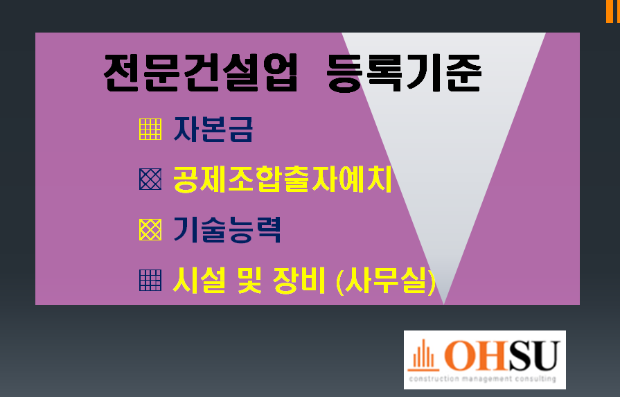 전문건설업은 건설산업기본법을 따르는데 자본금,공제조합출자,기술자,사무실 4가지 기준을 잘 지켜야