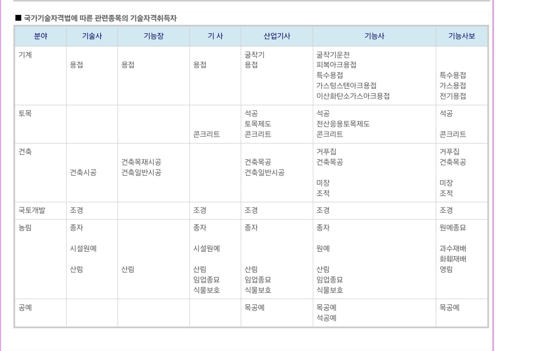 3) 한국산업인력공단에서 발급한 국가기술자격증중 해당되는 자격증종류가 정해져 있으므로 표에 해당되는