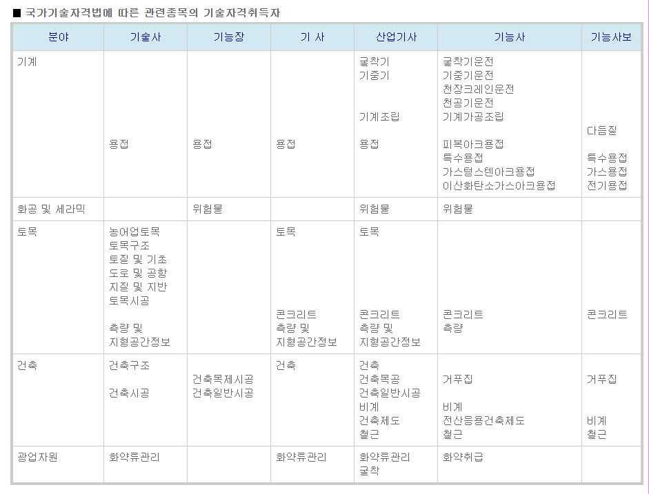 [한국산업인력공단에서 발급] 이나 건설기술진흥법에 따른 토목,건축,광업분야(화학류관리)의 초급이상 건설기술인으로 갖추면 되며 한국산업인력공단에서 발급받는 국가기술자격증표는 아래표를 참고하시길 바랍니다