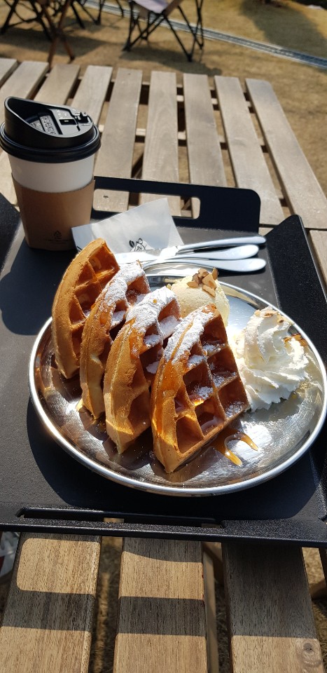 이곳 카페의 와플이 참 맛나요.제가 좋아하는 스타일인데 겉은 빠삭~속은 부드럽고 달짝지근한 맛이죠