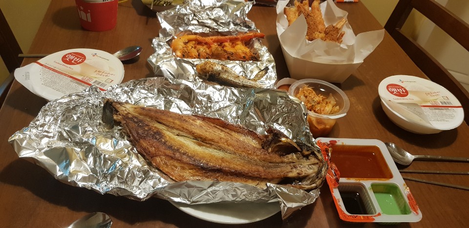 아이들과 대포항에 가서 오징어회와 생선구이,튀김등 이것저것 포장해와서 먹었네요