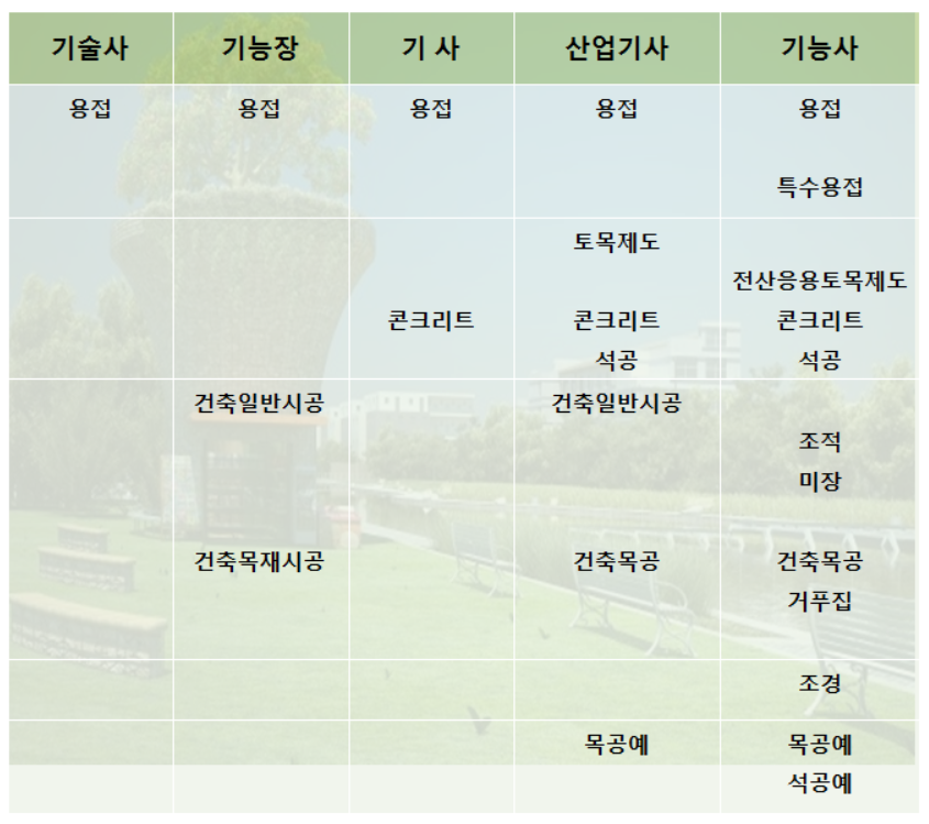 ②한국산업인력공단에서 발급한 아래표에 해당 국가기술자격증소지자나 건설기술인협회에서 발급받은 조경분야