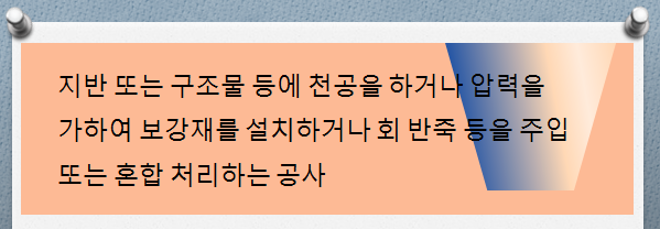 지반,구조물등에 천공 또는 압력을 가해서 보강재를 주입 처리하는공사를 하는 것으로 건축물이